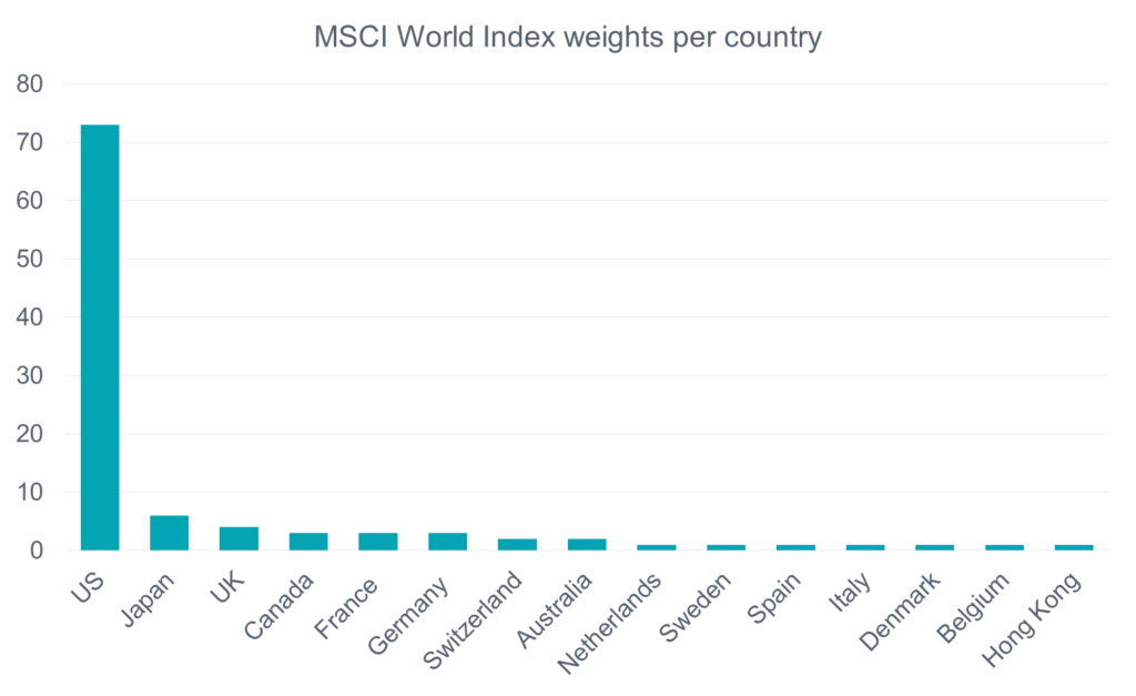 The US has 4% of the world’s population, 25% of global GDP, and 33% of global profits. However, given the excessive valuations of US companies, it now accounts for 73% of the MSCI World Index.
