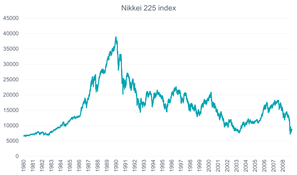 After reaching nearly 39,000 in December 1989, the Nikkei lost over 80% of its value over the next eighteen years.