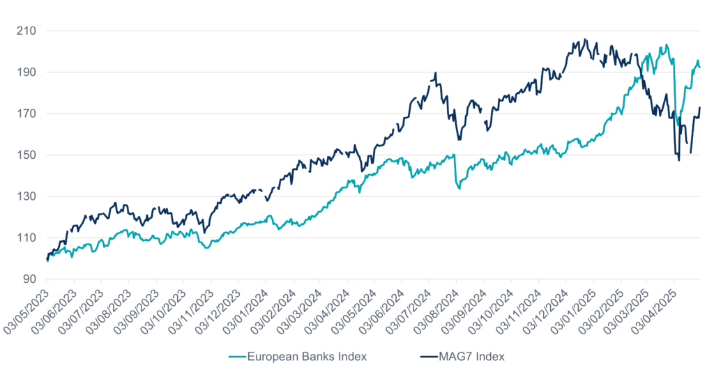 It may come as a surprise to many that the most unloved sector of the 2010’s (European Banks) has managed to outperform the ‘Magnificent Seven’ over the last two years. Despite the strong run of performance, valuations remain cheap and we believe earnings growth can continue to propel the share prices of European banks.