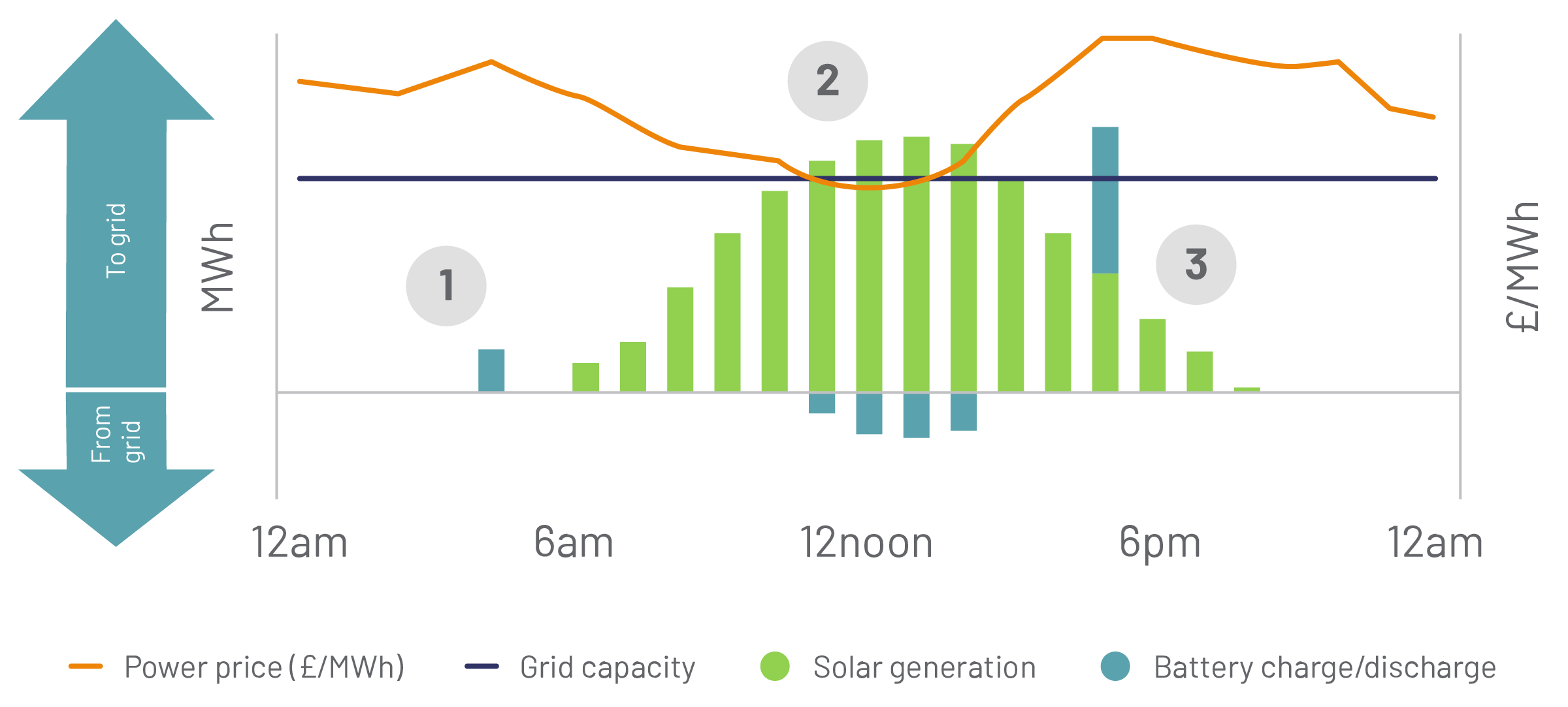 2. Solar dispatches to the grid during day, contributing to low power prices (linked to increased supply on the system). BESS charges during this low power price period. This could be from the grid, or (depending on site design) by using any solar generation which exceeds the grid capacity and would otherwise be wasted (or “spilled”).