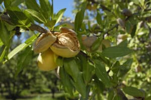 Orchard of ripening pistachio (Pistacia vera) nuts growing in clusters on a central California orchard.
